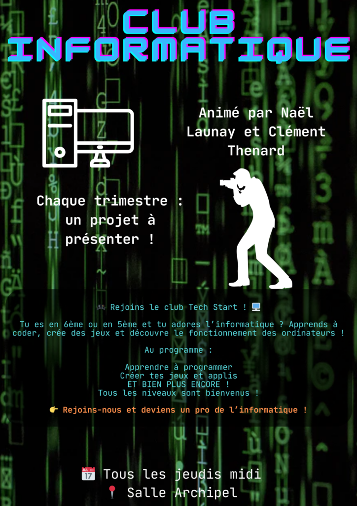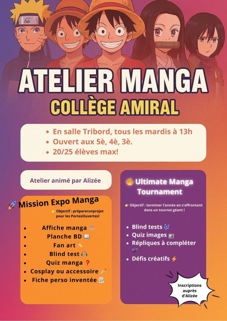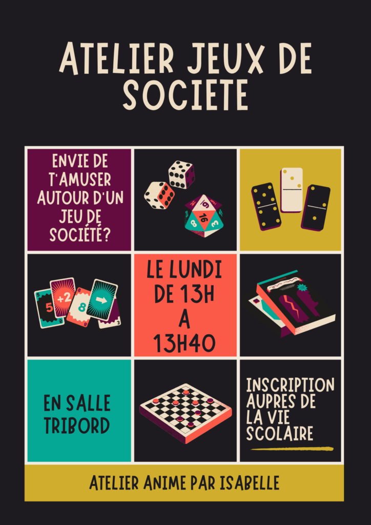 Chaque atelier est encadré par un adulte, le passage au self est organisé pour la pratique de l’atelier. Un forum des ateliers est organisé courant septembre pour présenter les ateliers de l’année à venir et leur déroulement. Voici le programme de cette année : | ![]() |